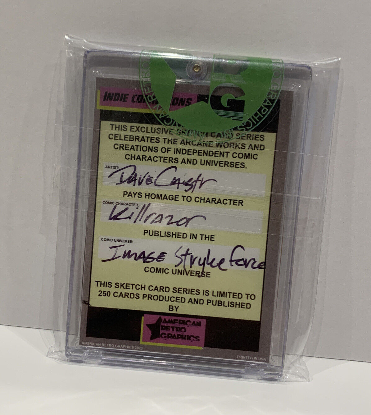 This card is a one-of-a-kind original drawing of Killrazor created by our staff artist Dave Castr. This card will arrive in a clear, hard plastic 2 piece trading card case, authenticated with our ARG label of curation and quality.